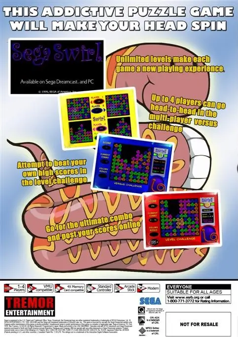 Sega Swirl is a puzzle game developed by Tremor Entertainment and published by Sega. It was originally released for Windows-based PCs (running Macromedia/Adobe Shockwave) but saw the most success as an updated Sega Dreamcast title. It was also brought to Palm OS. Sega Swirl is essentially a glorified version of SameGame (pronounced Sah-meh-gah-meh), a tile-removal game that has been mimicked numerous times. It is the creation of Scott Hawkins.