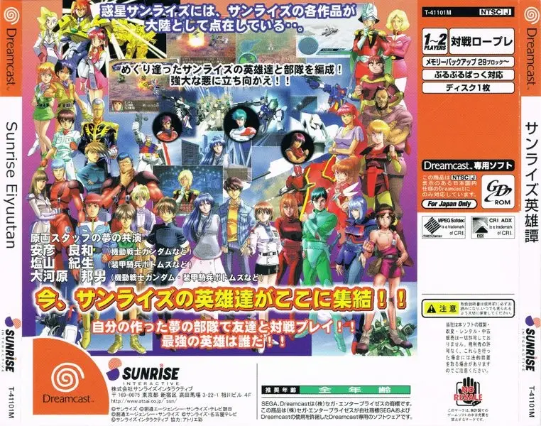 Sunrise Eiyuutan (サンライズ英雄譚) is a RPG game, developed by Atelier-Sai and published by Sunrise Interactive, which was released in Japan in 1999 for the Sega Dreamcast.