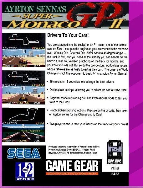 Ayrton Senna’s Super Monaco GP II (アイルトン・セナ スーパーモナコGP II) or simply Super Monaco GP II is a racing game developed and published by Sega for the Sega Mega Drive, Sega Master System and Sega Game Gear in 1992. It is a sequel to Super Monaco GP, but this time the game is sponsored by Ayrton Senna (who won the Monaco Grand Prix six times). Also unlike the previous game, Super Monaco GP II was not released in arcades or for any non-Sega console or computer.