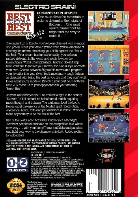 Best of the Best Championship Karate is a realistic fighting game. After you choose your fighter for his parameters (strength, stamina and resistance), you can choose from 55 different moves. You can now train your fighter at a gym before the real fights. To master the game, one must alternate training and fights, as training improves stamina, strength and resistance. Be careful, loosing a fight reduces those parameters, so you have to be ready before getting on the ring !