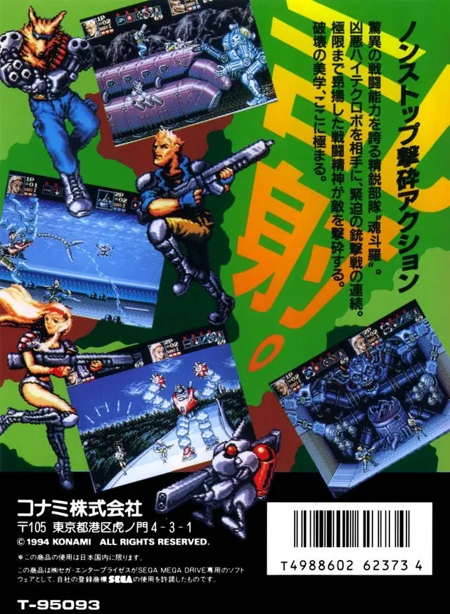 Contra: Hard Corps is a side-scrolling run and gun-style shoot-'em-up video game released by Konami for the Sega Genesis in North America and South Korea in 1994. It was also released for the Mega Drive as Contra: The Hard Corps (魂斗羅 ザ・ハードコア, Kontora Za Hādo Koa) in Japan, and as Probotector in Europe and Australia. It was the first game in the Contra series released for a Sega platform and serves as the first entry in the Hard Corps series, itself a subseries of the Contra franchise. It was re-released in June 2019 as part of Contra: Anniversary Collection for PlayStation 4, Xbox One, Nintendo Switch, and Windows, and was also included in the Genesis Mini dedicated console released in September 2019.