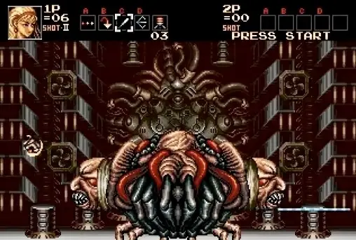Kickin' cyborg butt… That's what it's all about, dude. Jack into this game of genetic engineering gone bad. Real bad. It's five years after the mother of all wars ended – and things still aren't right. Your job is to fix it. The ever-popular Contra series makes its Sega Genesis debut with a pulse-pounding new storyline. At 16 megs, HARD CORPS pushes the technology to bring you over ten gut-wrenching levels with huge boss characters, great graphics and dynamic sound. Find high powered weapons such as the homing gun, crush gun, needle laser or mine setter. Do you think you can handle it? Trust me, you can't. You still here? Okay, then get ready for the fight of your life. Pick one of the four heroes and begin your search across many dark levels of doom. The ending changes, depending on the paths you choose – but every pass crosses boss characters that will blow you away. Literally!