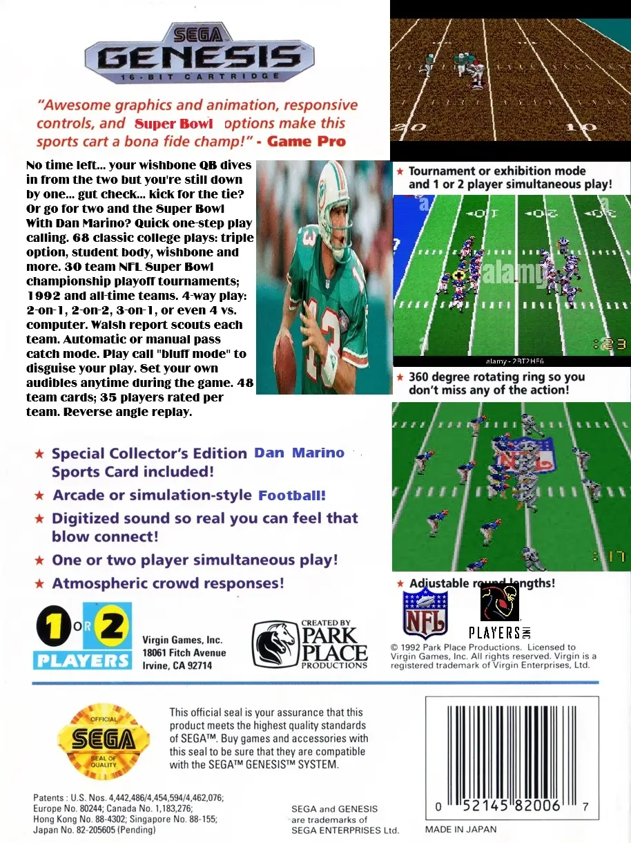 Dan Marino Powerplay Football is an unreleased Sega Mega Drive American football game endorsed by Dan Marino. It was being developed by Park Place Productions to be published by Virgin Interactive Entertainment, but the project was cancelled, likely due to Park Place shedding most of its staff in December 1993. It appeared at Summer CES 1993 in some form.