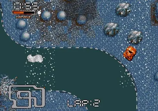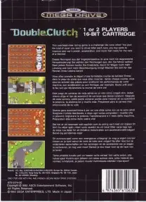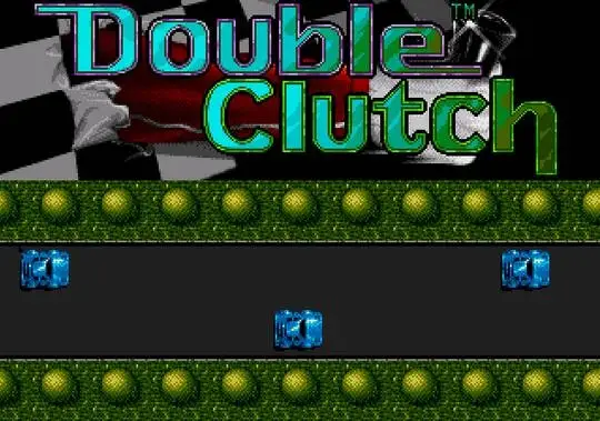 Double Clutch is an overhead racing game similar to Super Off Road. One or two players choose from four different drivers, each with their own special ability, then head out for a race on one of four different tracks. Of course, the goal is to be the first to finish three laps of the course, but watch out for your opponents; bump into them or the terrain and your vehicle will take damage. Take too much damage and it's game over! After each race, winnings can be used to upgrade or repair the vehicle. There are three difficulty levels, which affect how quickly the vehicle takes damage. There is also a practice mode where the player can freely choose any track.