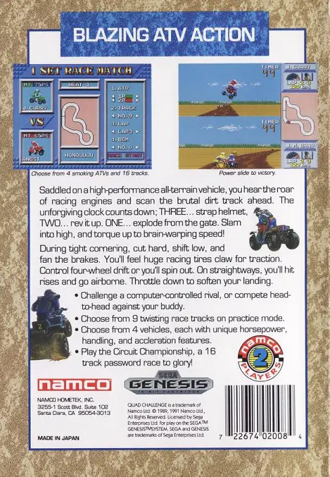 Saddled on a high-performance all-terrain vehicle, you hear the roar of racing engines and scan the brutal dirt track ahead. The unforgiving clock counts down; THREE… strap helmet, TWO… rev it up, ONE… explode from the gate! Slam into high, and torque up to brain-warping speed! During tight cornering, cut hard, shift low, and fan the brakes. You’ll feel huge racing tires claw for traction. Control four-wheel drift or you’ll spin out. On straightways, you’ll hit rises and go airborne. Throttle down to soften your landing. Challenge a computer-controlled rival, or compete head-to-head against your buddy. Choose from 9 twisting race tracks on practice mode. Choose from 4 vehicles, each with unique horsepower, handling, and acceleration features. Play the Circuit Championship, a 16 track password race to glory!
