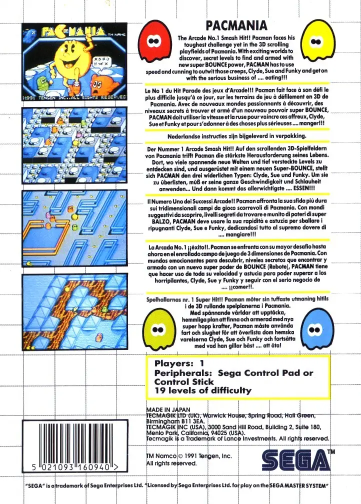 Pac-Mania is a variation on the game Pac-Man. You need to guide Pac-Man around a maze and eat all of the dots on the board in order to proceed on to the next round. Numerous, multi-colored ghosts also roam the maze trying to stop you. If you eat one of the power pellets in the maze, the ghosts will temporarily turn blue and run from you. Pac-man can earn bonus points by eating the ghosts when they are in this state. The maze is now in 3-D and is larger than screen which will scroll to follow the action. To help get out of tight spots, Pac-Man now has the ability to jump. But be careful, because some of the ghosts have learned this trick as well and you could end up in a mid air collision!