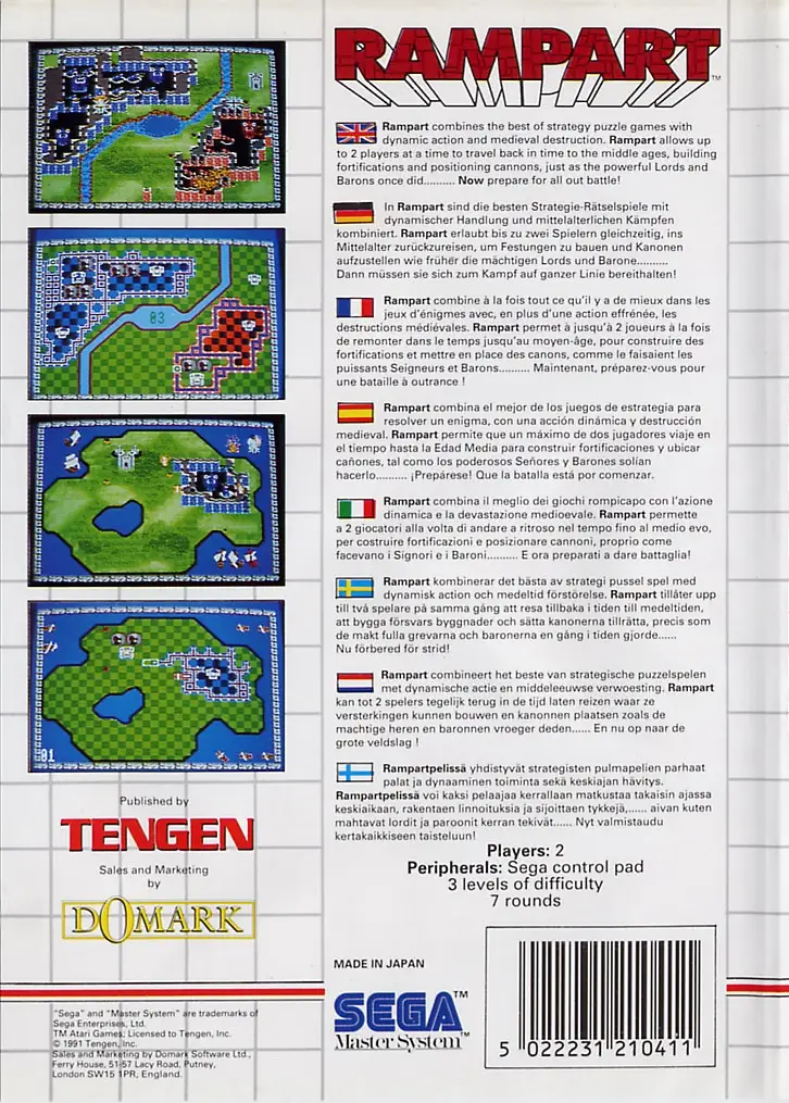 Rampart combines the best of strategy puzzle games with dynamic action and medieval destruction. Rampart allows up to two players at a time to travel back in time to the middle ages, building fortifications and positioning cannons, just as the powerful Lords and Barons once did… Now prepare for all out battle!