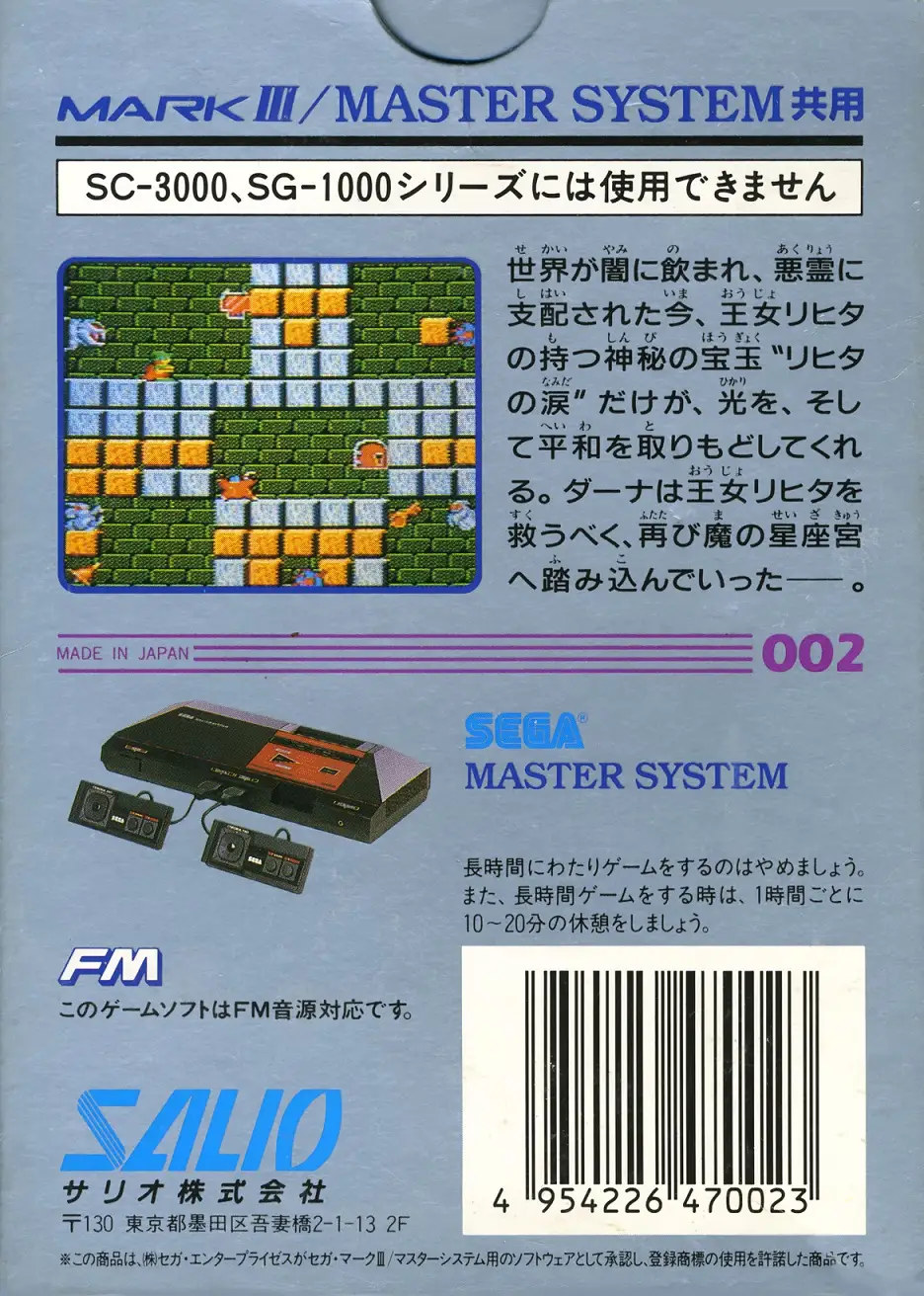 Solomon no Kagi: Oujo Rihita no Namida (ソロモンの鍵 王女リヒタの涙) is a platform-puzzle arcade game developed by Tecmo, which was subsequently brought to the Sega Master System by Salio in 1988. The game was brought to the west via other platforms as Solomon’s Key, though the Master System version remained exclusive to Japan.