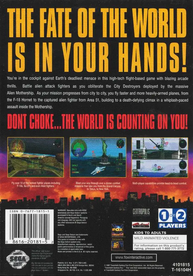 Independence Day is a combat flight simulator video game based on the 1996 film of the same name. The game was developed by Radical Entertainment and published by Fox Interactive for Microsoft Windows, PlayStation and Sega Saturn.