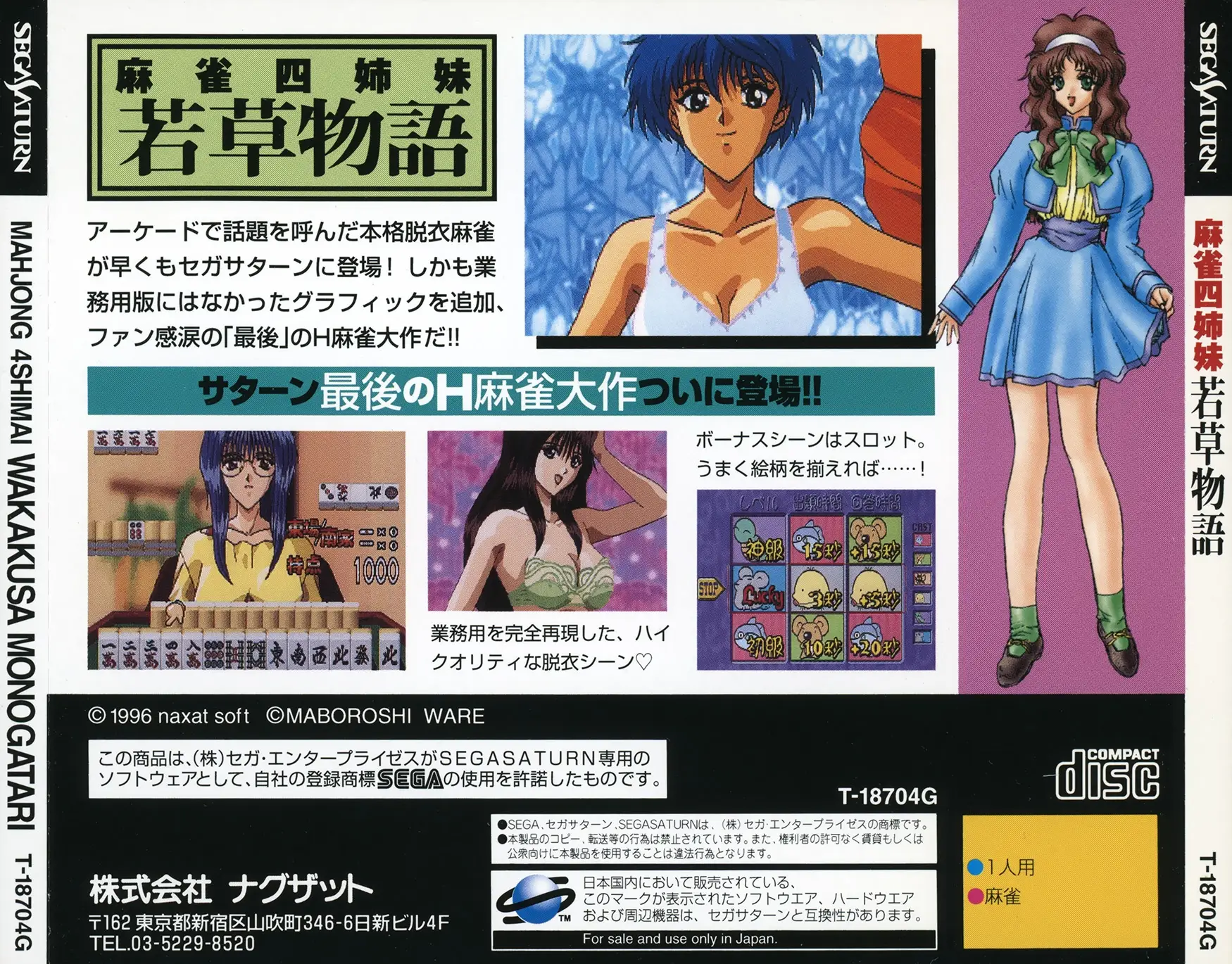 Mahjong Yon-Shimai: Wakakusa Monogatari [ 麻雀四姉妹 若草物語 ] is a strip mahjong game developed by Maboroshi Ware and published by Naxat Soft. The game released exclusively in Japan on the SEGA Saturn, and is a console port of the arcade game of the same name.