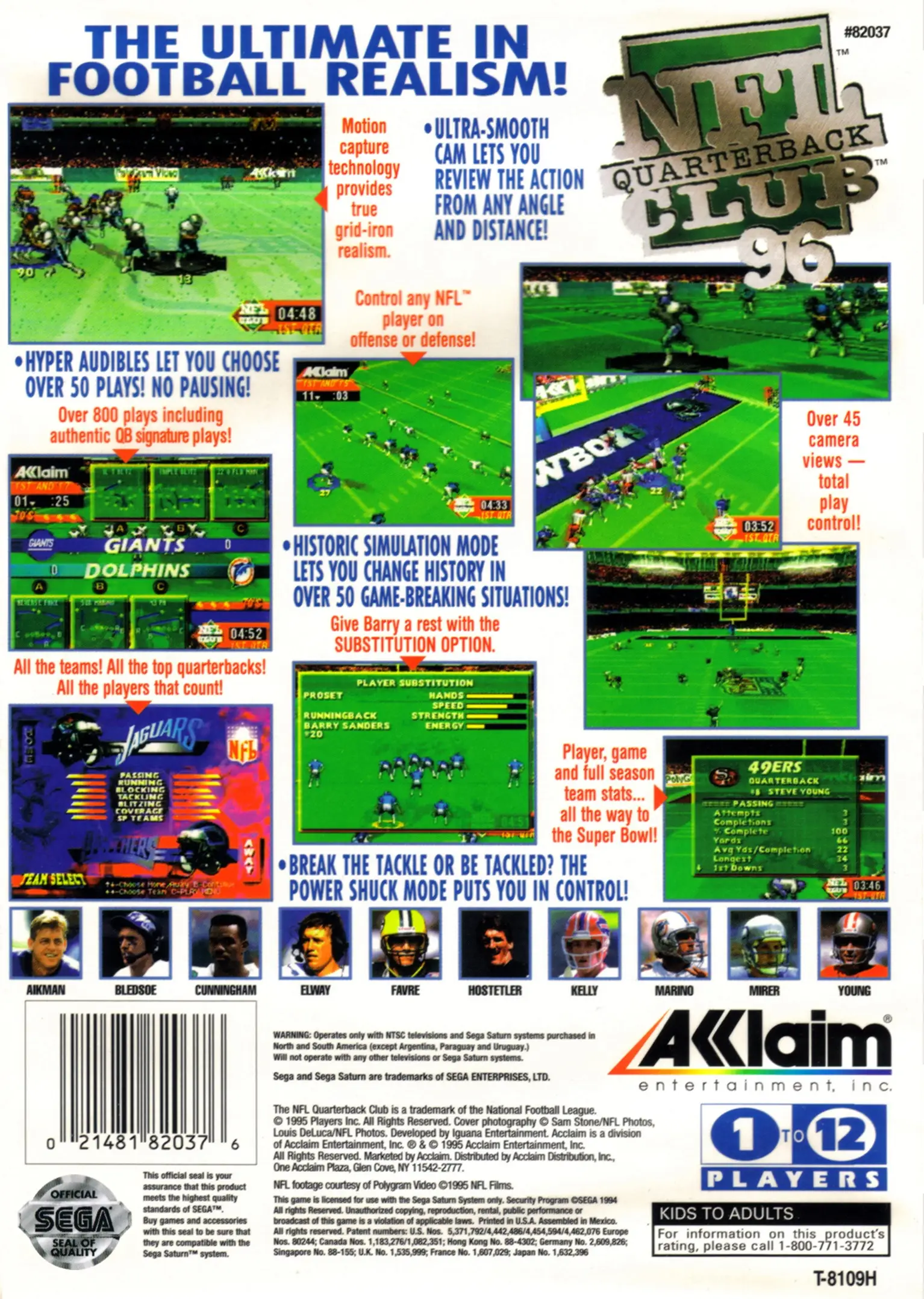 NFL Quarterback Club 96 is an American football video game released in December 1995. The game was released on the Sega Saturn,[1] Sega Genesis,[2] Game Boy,[3] Sega Game Gear,[4] DOS, and Super Nintendo Entertainment System.[5] The game’s cover features San Francisco 49ers quarterback Steve Young passing while being tackled by Chicago Bears defensive lineman Chris Zorich and an unidentified defender. The Saturn, SNES and DOS versions were developed by Iguana Entertainment, while the Game Boy edition was developed by Condor Inc.