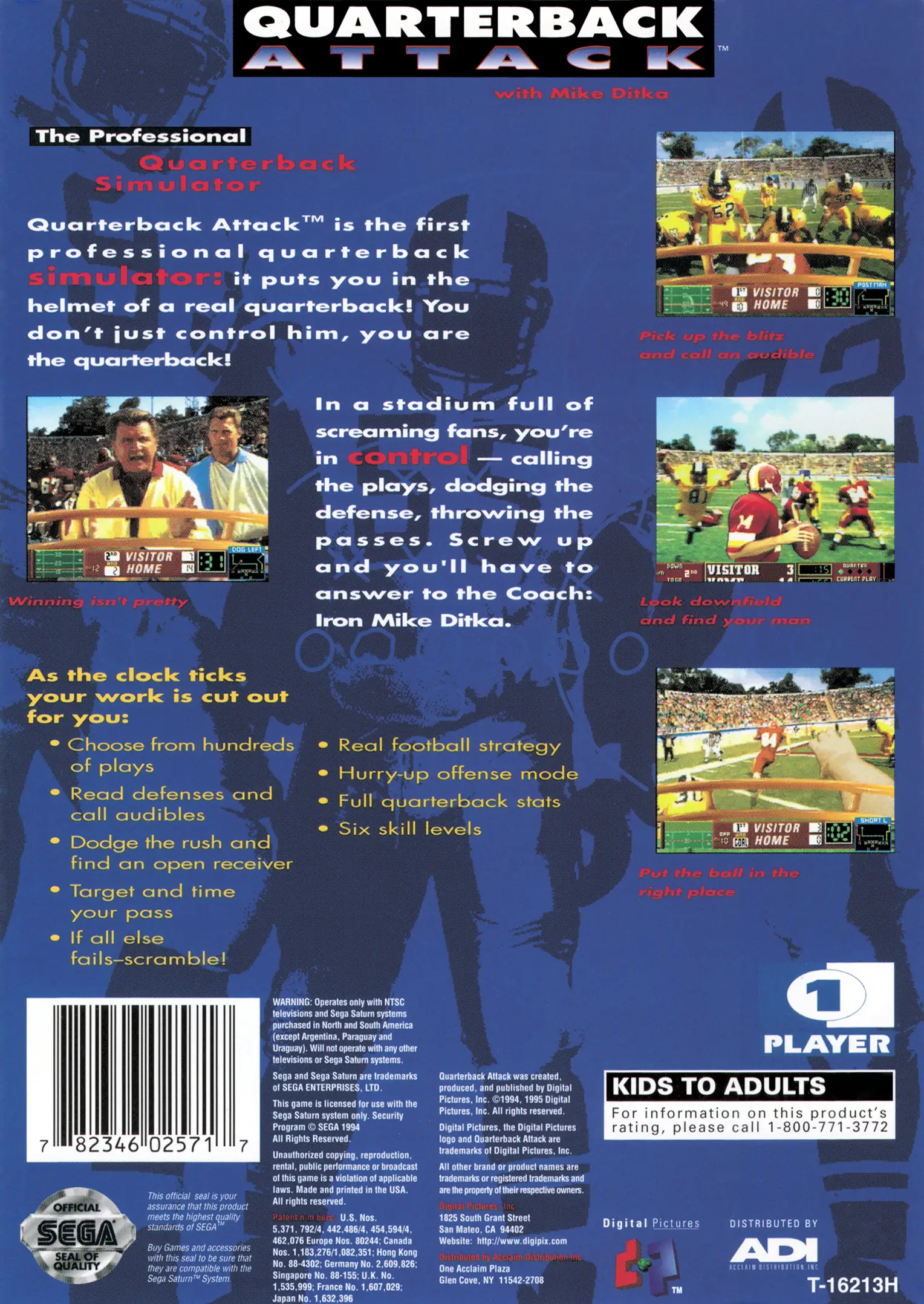 Quarterback Attack with Mike Ditka is a 1995 football game published by Digital Pictures for the Sega Saturn, 3DO and DOS. It features Mike Ditka as head coach of the player’s team. The only player players can control is the quarterback and the defense is rendered in full motion video.