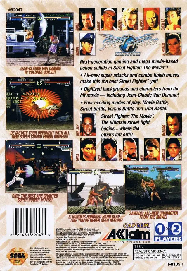 Street Fighter: The Movie, released in Japan as Street Fighter: Real Battle on Film (ストリートファイター リアルバトル オン フィルム?), is a head-to-head fighting game released for the PlayStation and Sega Saturn in 1995.[1] The game is based on the 1994 live-action Street Fighter movie and uses digitized images of the film ’s cast posing as the characters in the game. While it shares its title with the arcade game Street Fighter: The Movie, the home version is not a port but a similar game developed on the same premise.[2] The home version was developed and published by Capcom in Japan and released in North America, Europe and Australia by Acclaim.