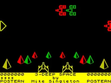 3 Deep Space is a side view shooter with the whole game shown on the screen and you must blast as many ships as you can which move down the screen towards your craft at the bottom. If you touch any ships or allow a Dragon Class Starcruiser past yourself then it is game over. The main selling point of the game was that it was in 3D and used 3D glasses provided with the game. As well as moving left and right along the screen, you could actually move in and out of the screen as well. The enemy ships moved down the screen at different depths of the screen as well.