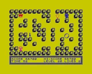 To complete a level, it's imperative to acquire at least all of the objects present in the scenario during the mentioned periods of time. Only then, the player can start accumulating points which will randomly appear in the maze in the form of collectable objects. These “objects” start to appear in a succession of pairs of 200, 500, 700 and 1000 points. After all the points in the double succession are picked up, a question mark shows up on a random point of the maze. If successively picked it will allow the player to immediately finish the level without having to wait for the rest of the necessary time to pass the level.