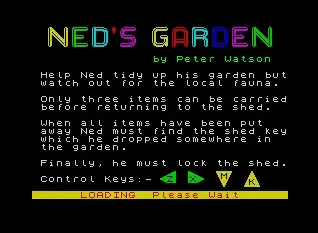 Title:Ned’s Garden Release Year:1985 Original Publisher:16/48 Tape Magazine (UK) Creators:Peter Watson (UK) Language:English Type:ZX-Spectrum 48K Genre:Arcade Game: Maze Maximum Players:1 Original Publication:On magazine covertape