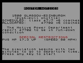 :Scotrail Express 1984 Original Publisher:Dee-Kay Systems (UK) Language:English Machine Type:ZX-Spectrum 48K Genre:Game: Simulation Maximum Players:1 Other platforms:BBC Micro, Commodore 64