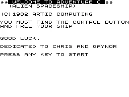 While on a reconnaissance flight, your ship has been drawn by a Graviton Beam onto an Alien Cruiser. Fred, your pet android, informs you that the cruiser is on a Humanoid slave mission, its aim to seek out Humanoid planets from which samples are taken and their brains replaced by microchips. Your aim is to free your ship by pressing the control button in the main computer room. Of course, expect various hazards and puzzles to be in your way. The game features a simple 'Verb Noun' command interface, and no graphics of any description. Instructions such as 'insert key into hole' have to be split into two commands.