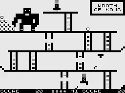 Wrath of Kong is a Donkey Kong variant. A girl called Jane has been captured by Kong and it's up to the player to go into his lair and rescue her. By climbing ladders and jumping between platforms the player has to make his way to the top of the screen where Jane is located. At the same time it's necessary to avoid the barrels that Kong throws toward the player.