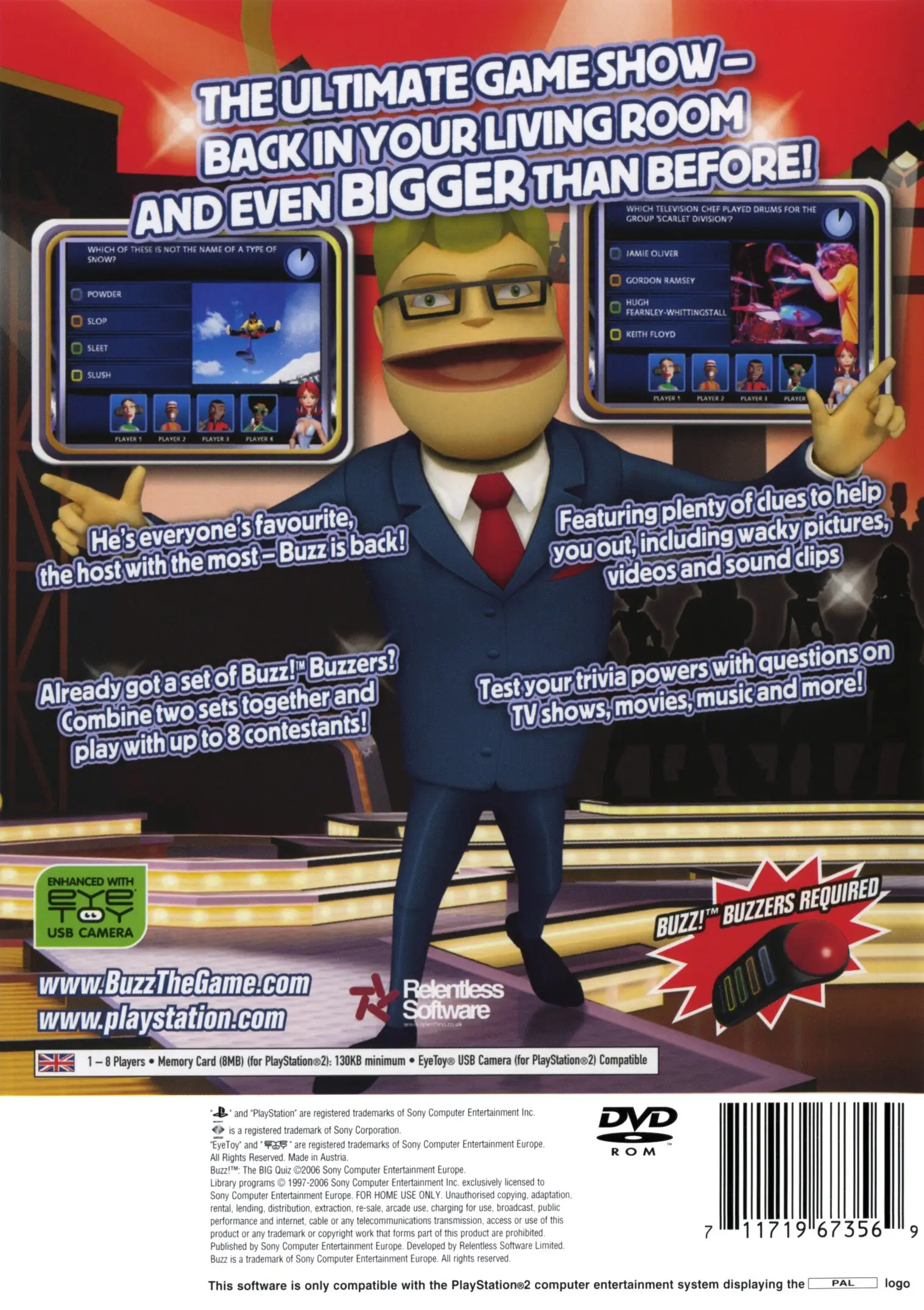 Buzz!: The BIG Quiz is a general knowledge quiz game that uses four bespoke USB buzzers, introduced in Buzz!: The Music Quiz, instead of the usual PlayStation 2 dual shock controllers. This means that four players can play right away.