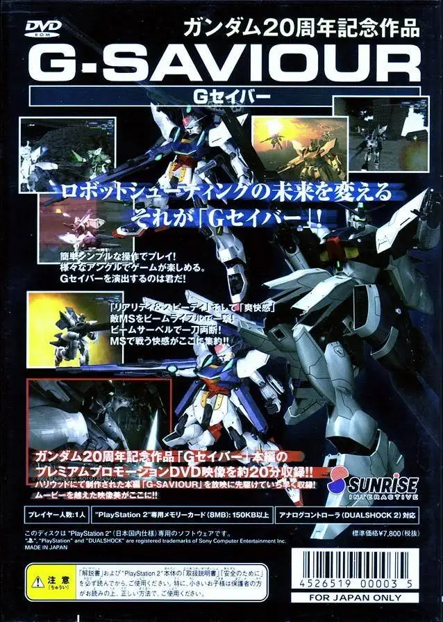 G-Saviour is a PlayStation 2 video game released in September 2000 to promote the then upcoming release of the film of the same name on Japanese television. The game’s storyline takes place one year after the events of the movie. It plays like a third-person shooter with an emphasis on locking and thrusting.