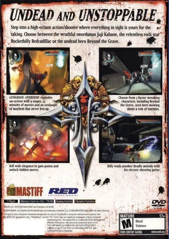 Much like its predecessor, Gungrave: Overdose offers up several action-packed levels that simply don't allow the player to let up on the fire button. This sequel ups the ante with even larger hordes of enemies to blast through along with a slew of destructible environments to wreak havoc in. Along the way, Grave will team up with newcomers Juji and Billy. Juji fights using a unique combination of close-range guns and swordplay, while Billy defeats his enemies with the sheer power of his electric guitar.