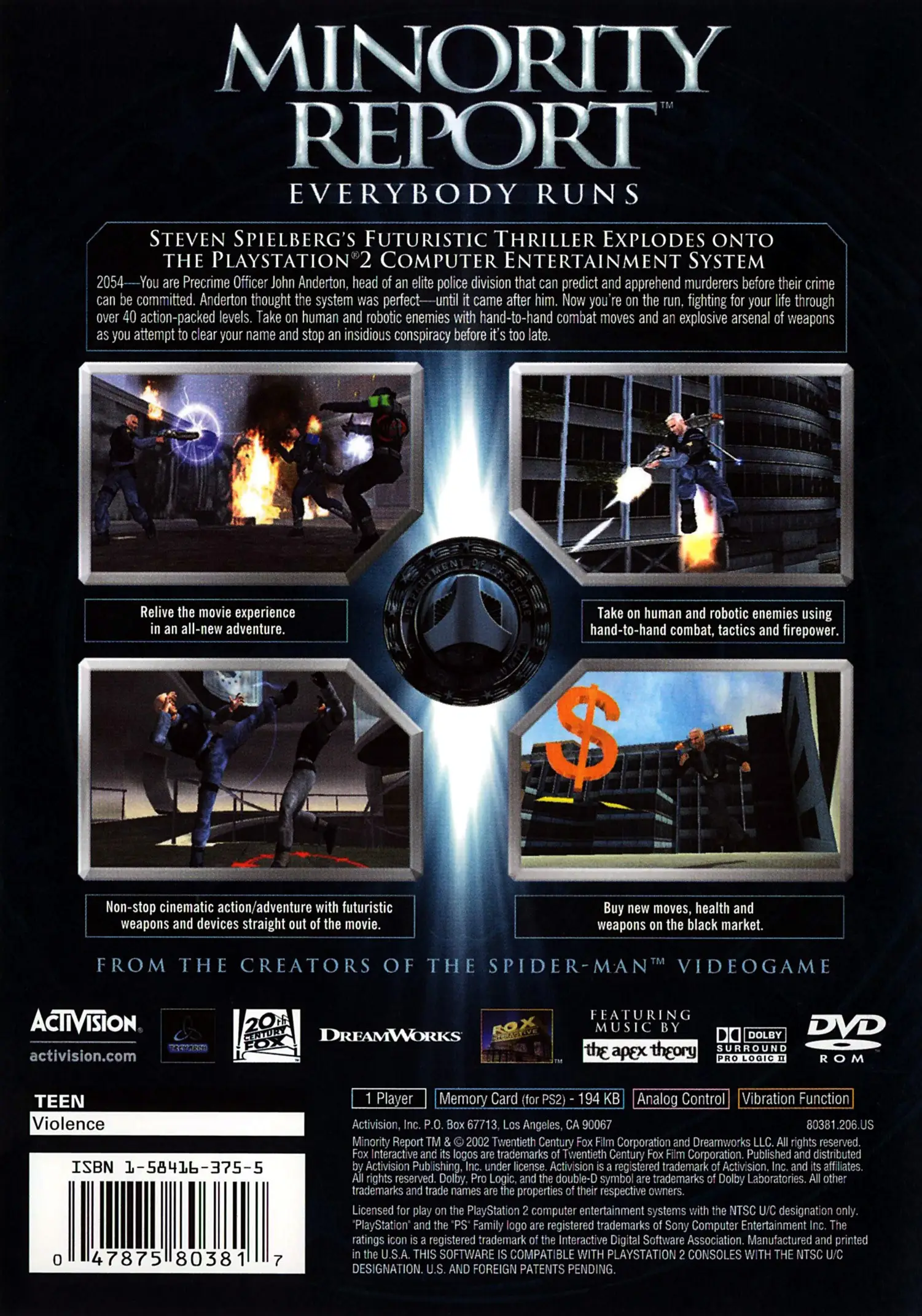 The player assumes the role of John Anderton, a man on the run after “Pre-Cogs” predict him murdering a man named Leo Crow. The player treks through different parts of Washington DC, from the Pre-Crime HQ to the slums and factory areas, to clear John’s name and solve the mystery behind his murder accusation.