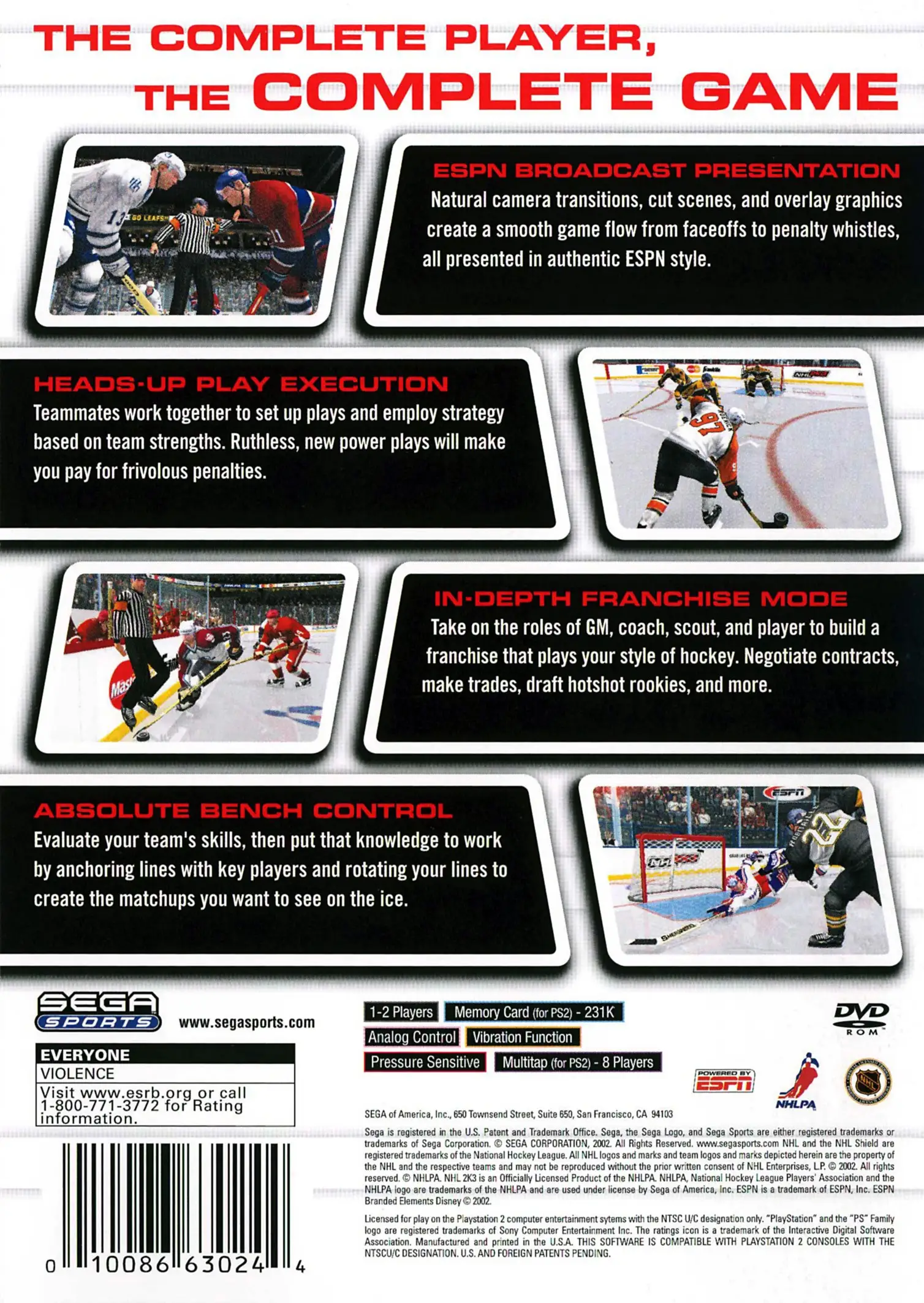 Using it’s partnership with the ESPN sports network, Sega has created NHL 2K3 using the same presentation method as ESPN. Natural camera transitions, cut scenes, and overlay graphics are all used in cooperation with ESPN to give the game a more realistic feel.