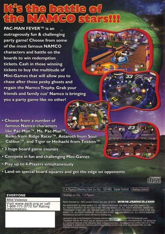 Pac-Man takes break from eating dots and ghosts in the fun new party game Pac-Man Fever. In addition to our yellow hero, the game also features Ms. Pac-Man and many other Namco favorites from franchises such as Tekken, Ridge Racer, and Soul Calibur. Up to four players partake in more than 30 minigames and three differently themed game boards. Try to recover all of the minigames stolen by those pesky, party-crashing Ghosts and determine who the real party animal is.