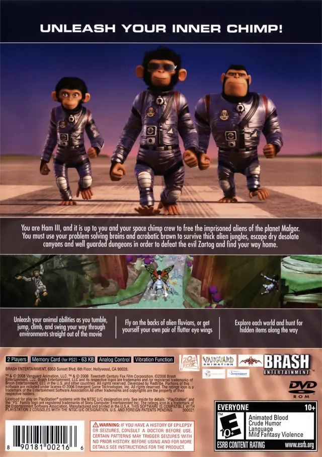 Based on the film, Ham III, grandson of the first chimpanzee in space, teams up with fellow space-mates Luna and Titan to a space adventure and trip to an unknown extraterrestrial planet. Which the player plays two characters, Ham and Luna, through levels defeating enemies in order to defeat Zartog and save their friend, collecting the color gumdrop-shaped objects call Globtrotters as well as Bananas which would allow the players to access extras such as character concepts, artwork and videos.