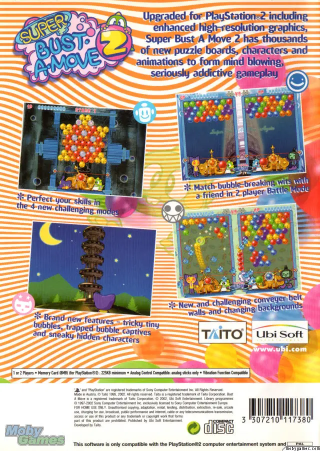 Super Bust-A-Move 2 offers arcade-style action and screen-clearing puzzle solving in an immersive environment full of vivid characters. It features a single-player puzzle mode that lets you play through multiple stages and multiple game types as each of the stories behind each of the game’s characters is explained, and information is gradually revealed. There is also a battle mode that lets you challenge your friends or the computer as you compete in a best-of-three match. You can also create your own mind-bending, bubble-busting puzzles, play them, and save them to a memory card to challenge your friends. There is a scalable difficulty feature that adjusts the game for players of all skill levels.