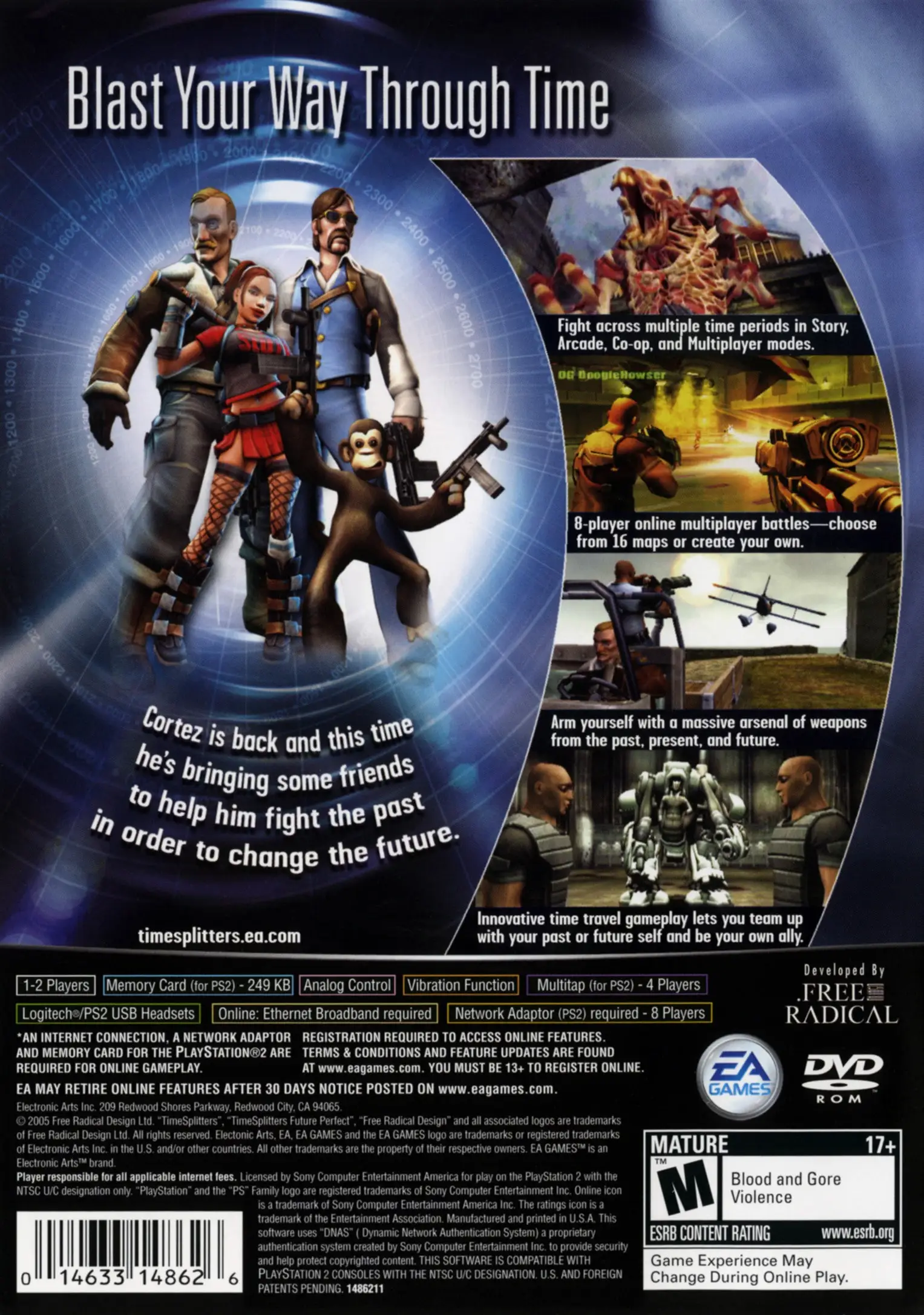 In the year 2401 the space marine Sergeant Cortez is leaving the space station that he visited in the end of his previous journey. He soon discovers that the crystals he has found can power up a time machine. After having located traces of TimeSplitter activities in various time periods on the Earth, Cortez boards the time machine and travels to these periods, hoping to aid various characters in their battles against evil.