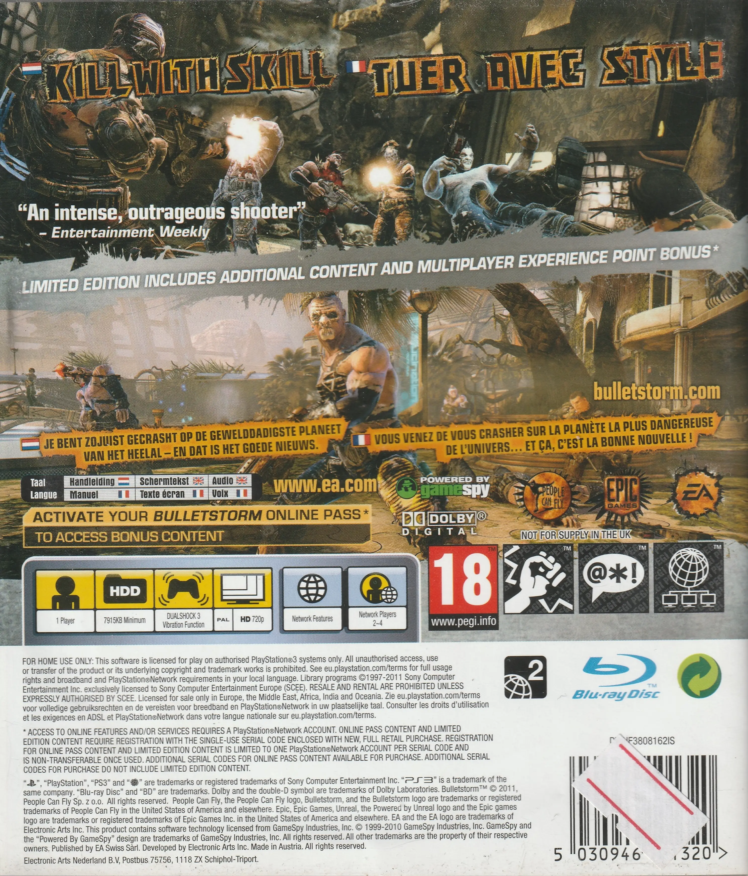 Bulletstorm is a 2011 first-person shooter game developed by People Can Fly and Epic Games and published by Electronic Arts (EA). The video game is distinguished by its system of rewarding players with “skillpoints” for performing increasingly creative kills. Bulletstorm does not have any competitive multiplayer modes, preferring instead to include cooperative online play and score attack modes. Set in the 26th century, the game's story follows Grayson Hunt, a space pirate and former black ops soldier who gets shot down on a war-torn planet while trying to exact revenge on General Sarrano, his former commander who tricked him and his men into committing war crimes and assassinating innocents.