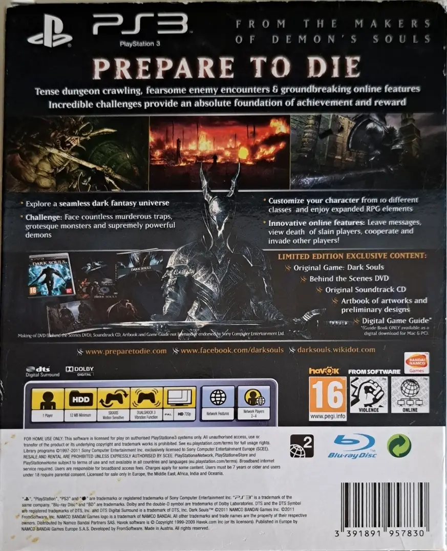 Dark Souls' Limited Edition for the Sony PlayStation 3 console is an action role-playing game from video game developer FromSoftware and publisher Namco Bandai. A second installment of the Souls series, 'Dark Souls' is set in the fictional kingdom of Lordran and the main character is a cursed undead character tasked to go on a journey and discover the fate of the undead. Playable in single player and multi-player modes, 'Dark Souls' is set as an open world game where players have the option of following the story line or veer off and explore the vast expanse of the Lordran kingdom and accomplish side quests. The gameplay basically involves exploration, solving puzzles, accomplishing tasks, and battling creatures in the open world environment.