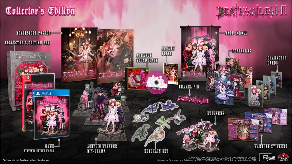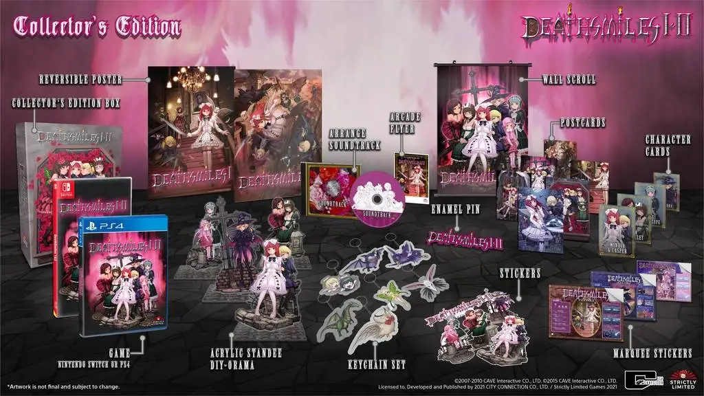• Includes Deathsmiles (Arcade, Version 1.1, Normal), Mega Black Label Edition (Arcade, Version 1.1, Normal) and Deathsmiles 2 (Arcade, IIX, Arrange) plus the “Gothic wa Mahou Otome” DLC on cart/disc.