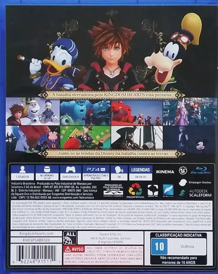 Combina os mundos da Disney e Final Fantasy Sora retorna com o Pato Donald, Pateta, Rei Mickey e Riku para impedir o plano de Mestre Xehanort; Número de jogadores: 1 jogador; Conteúdo ESRB: Violência de fantasia; Gênero: Ação e aventura; Interpretação de papéis.