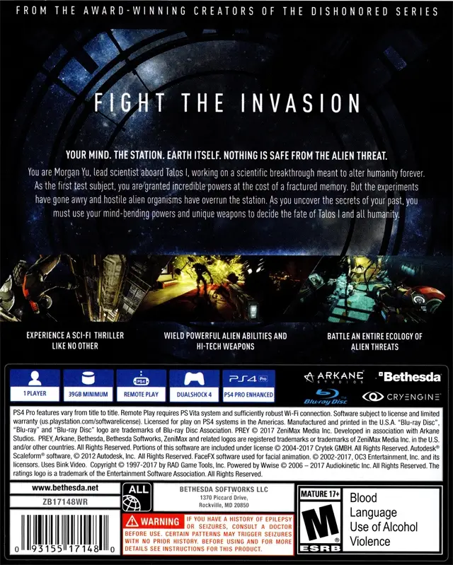 Prey is a first-person action-adventure video game developed by Arkane Studios and published by Bethesda Softworks. The game was released in May 2017 for Microsoft Windows, PlayStation 4, and Xbox One.