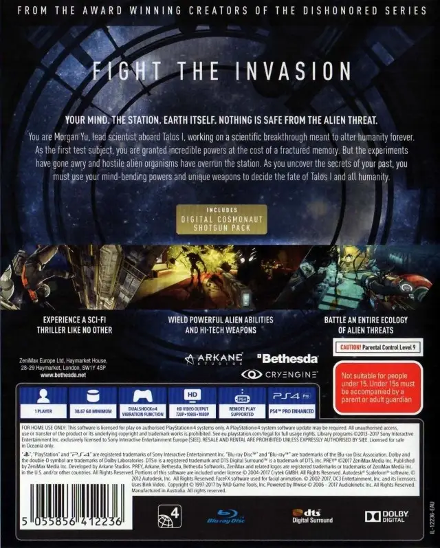 Prey is a first-person shooter video game developed by Arkane Studios and published by Bethesda Softworks. It was released worldwide on 5 May 2017, for Microsoft Windows, PlayStation 4 and Xbox One.