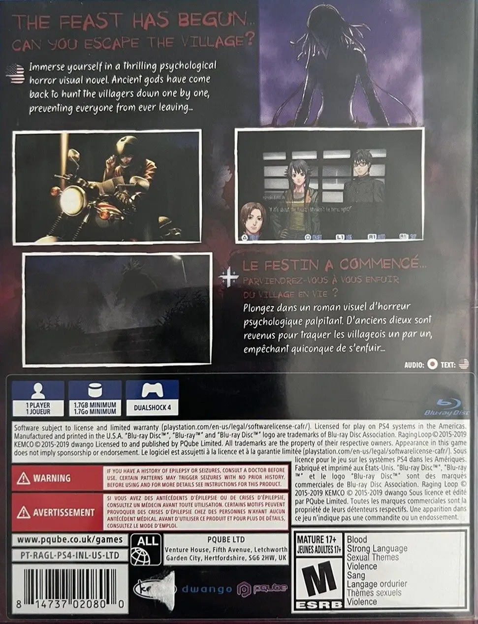 Raging Loop, also known as Rei-Jin-G-Lu-P, is a Japanese visual novel developed by Kemco and released on December 3, 2015 for iOS and Android smartphones. It was later ported to the PlayStation Vita, PlayStation 4 and Nintendo Switch consoles and Windows.