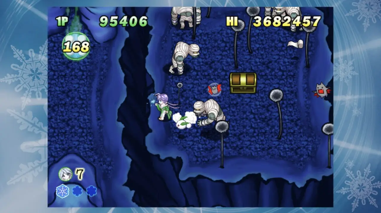 With your trusty bunny Toto at your side, use different types of snow magic, upgrade them and blast your way through the hordes of yokai and other monsters standing in your way!