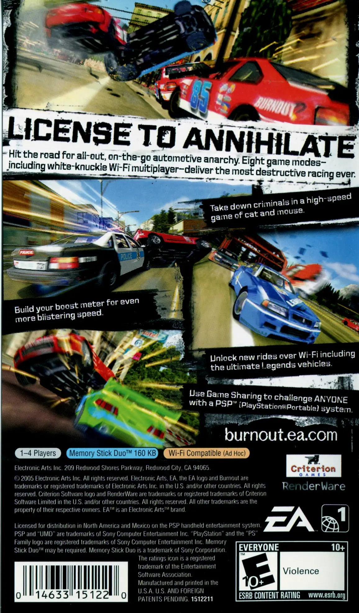 The Burnout series goes portable with Burnout Legends for the PSP. You can play through redesigned tracks from the earlier Burnout games in nine different game modes, including Crash mode and Pursuit mode. Burnout Legends also contains new unlockable cars and content. You can challenge up to four other players to battle wirelessly in a single game or an entire customizable championship.