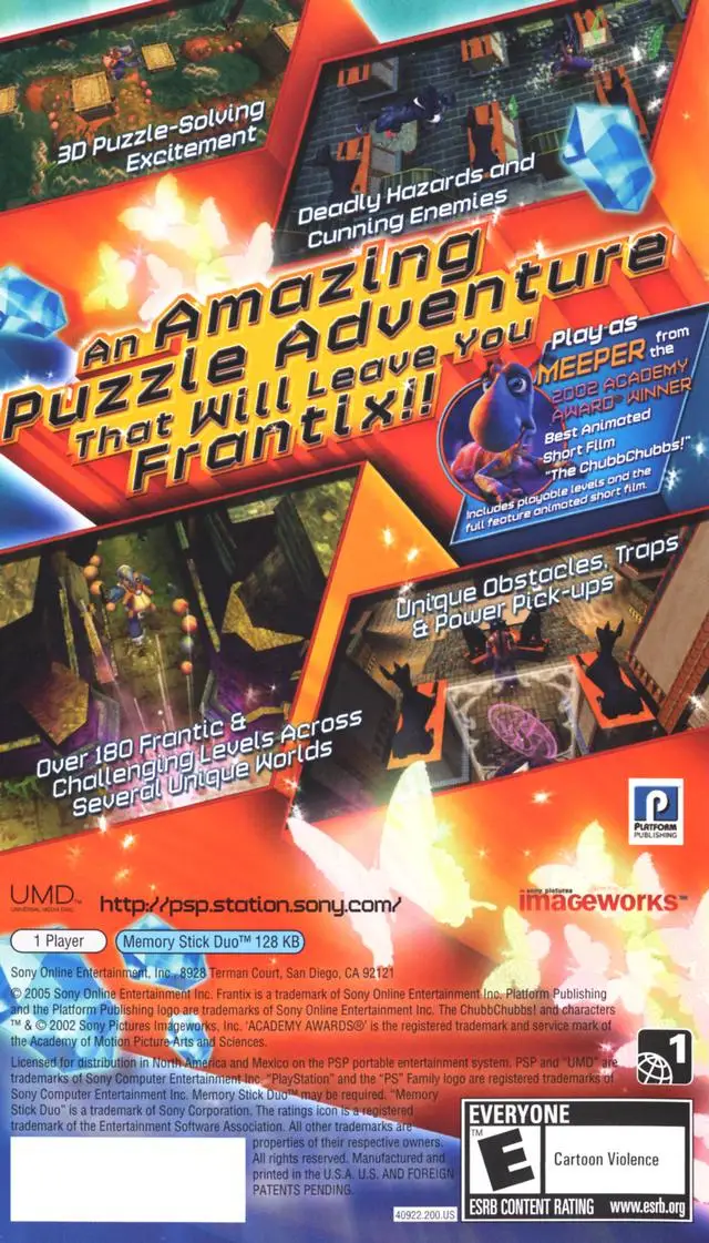 Frantix is a video game on Sony’s PlayStation Portable. The game contains over 150 levels (most need to be unlocked). The player must race against the clock in order to solve each puzzle. Some levels are tricky and the most obvious path may not be the best route to go. In each level there are obstacles, deadly traps, hazards and creatures which can delay the player from completing the level.