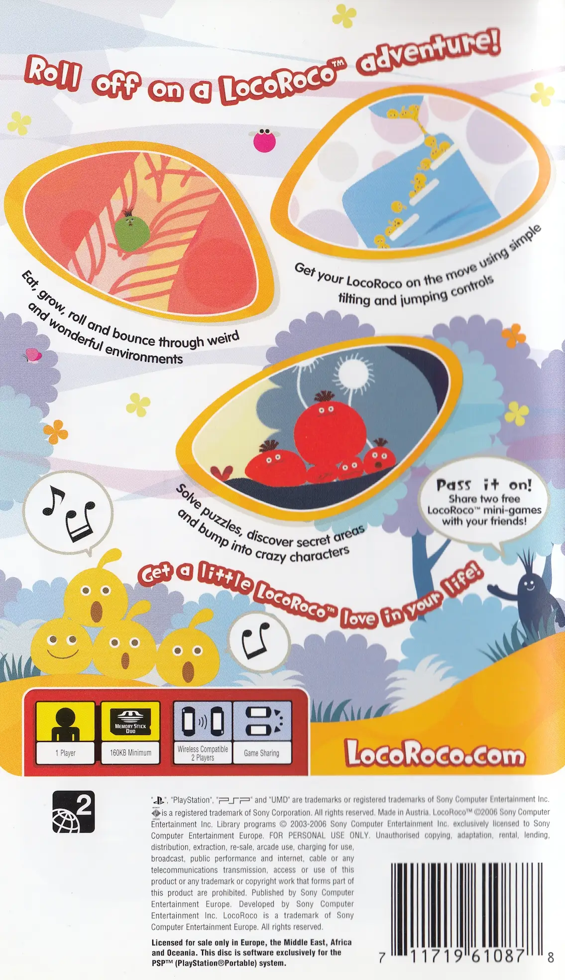 LocoRoco is an innovative 2D platform/action game available exclusively for the PSP. Featuring unique controls utilizing the “L” and “R” shoulder buttons, players are tasked with controlling via “tilting or bumping” the landscape of the LocoRoco in order to help them navigate through the level and keep them out of harm's way. With more than 40 stages, players control and guide the LocoRoco through vibrant, thriving and lush worlds filled with slippery slopes, swing ropes , and more. Featuring six different types of LocoRoco that include their own voices and actions, players will be enchanted by captivating music that communicates the joyous world of these LocoRoco. In addition, LocoRoco features the rewarding LocoHouse, three mini-games , and wireless features. The peaceful world of the LocoRoco are under attack by the not-so-nice Moja Corps. These evil outer space creatures want nothing but to capture the blissful LocoRoco and take them from their land of blowing flowers, lively creatures and pastel scenery. As the planet where the LocoRoco inhabit, players must tilt, roll and bounce the LocoRoco to safety.
