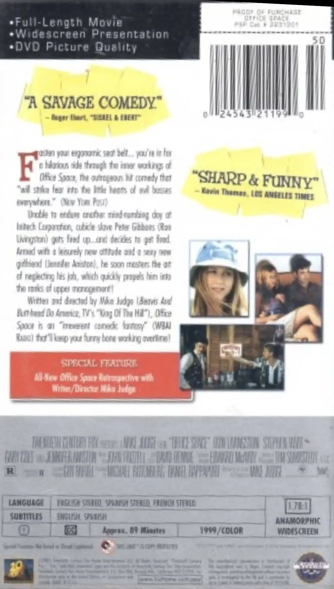 Unable to endure another mind-numbing day at Initech Corporation, cubicle slave Peter Gibbons (Ron Livingston) gets fired up and decides to get fired. Armed with a leisurely new attitude and a sexy new girlfriend (Jennifer Aniston), he soon masters the art of neglecting his work, which quickly propels him into the ranks of upper management! Now the stage is set for Peter to carry out a high-tech embezzling scheme that's sure to mean the end of his job and a one-way ticket to easy street. Can he pull it off before all corporate hell breaks loose?