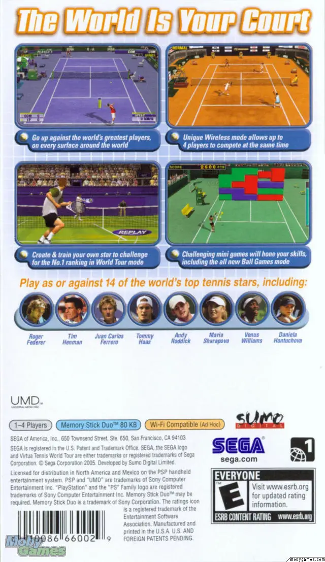 Virtua Tennis: World Tour is the PSP incarnation of Sega’s Virtua Tennis series. You can play as one of many professional tennis players, such as Roger Federer or Maria Sharapova, on courts around the world. In addition to Exhibition and Tournament modes, you can create a custom player and play through World Tour mode. Virtua Tennis: World Tour also lets you play stat-building minigames and challenge up to four other players in Versus mode.