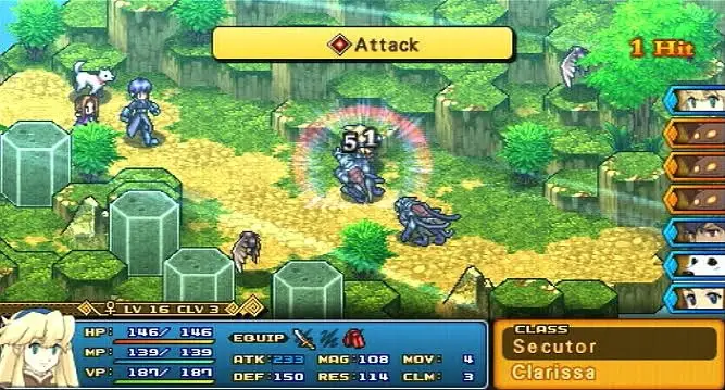 Wild Arms XF is a 2D turn-based tactical role-playing game, creating a gameplay experience somewhere between Dungeons & Dragons and chess. Players are given control of a small squad of characters (six or less) and placed on a grid-based map resembling a geographical location (a swamp, a town, a river), upon which they fight battles to progress through the game. As with most T/RPGs, positional advantage can be critical to victory, and players are encouraged to outmaneuver their enemies as well as outgun them. The game emphasizes positioning and maneuvering by the inclusion of “Formation Arts,” which increase attack damage when an enemy is surrounded by your characters in a line, a triangle or a circle. Wild Arms XF is a member of the small subsection of T/RPGs whose battlefields are based around hexagonal tiles instead of squares. “Combination Arts” return from previous Wild ARMs titles, allowing characters to target an enemy in a waiting state and then deliver their attacks simultaneously with the next ally to attack their target. If the player succeeds in executing an uninterrupted series of commands, the damage inflicted upon enemies will increase significantly. On the other hand, the enemy gets the same advantage.