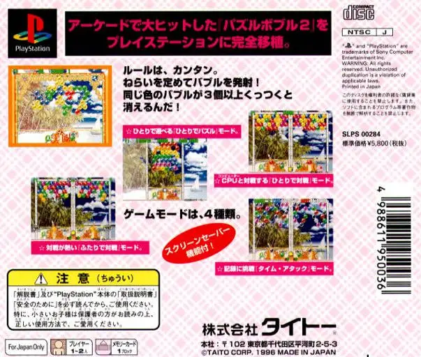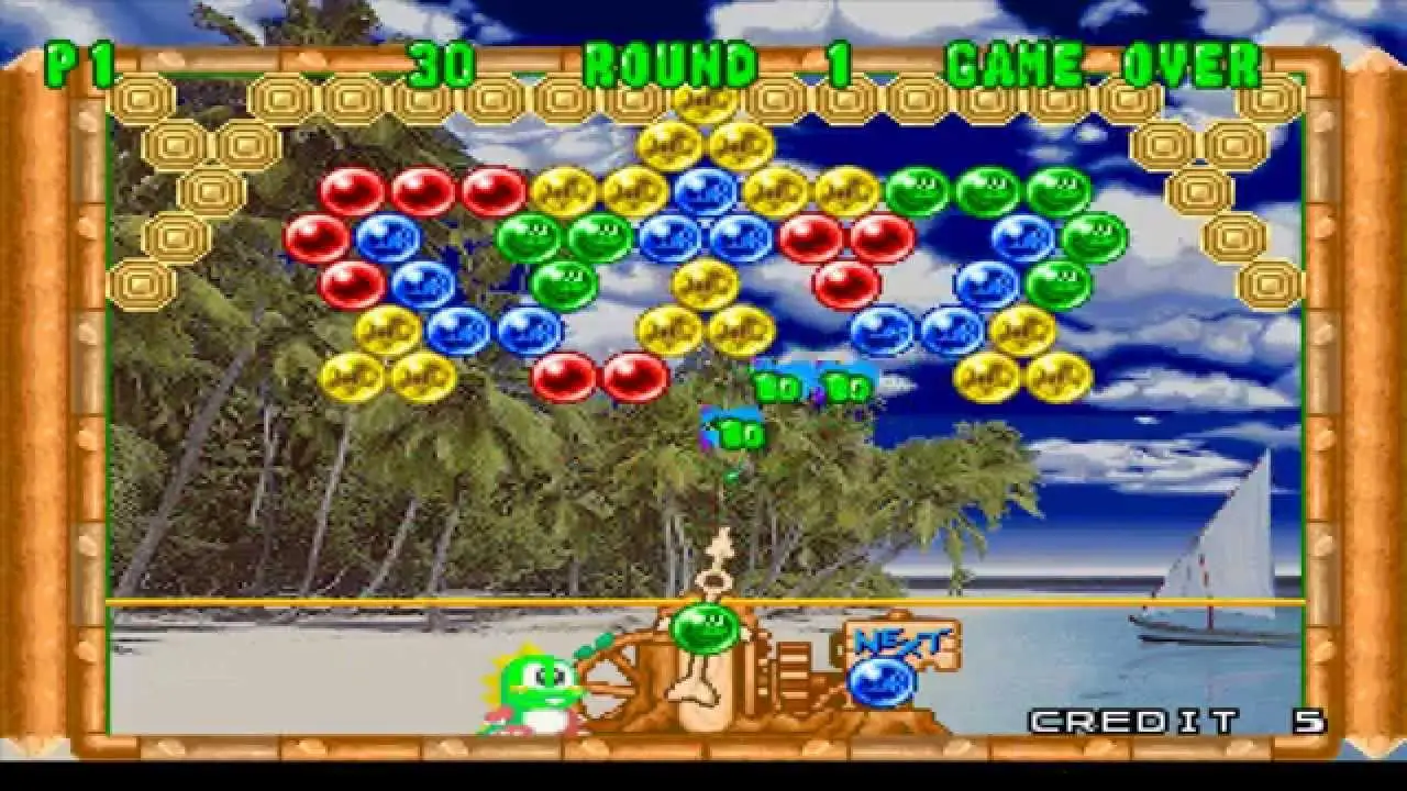 BUST-A-MOVE 2 aka Puzzle Bobble 2 (JP) is the lightning quick, ultra-intense, 100% addictive, arcade puzzler that's gonna grab you and never let go! As the balls descend, you're gonna need sharp eyes and quick reflexes to match 3 or more balls and pop them…fast! Insane two player action pits you against an opponent in a race to bust or be busted!!