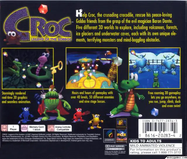 All is not well in Croc's world. His friends, the Gobbos, have been captured by the evil Baron Dante. It is your mission in this 3D platformer to search through 42 different levels to save all of your friends before it's too late.