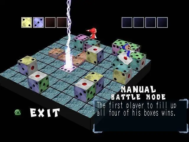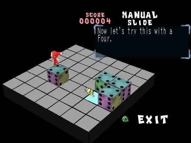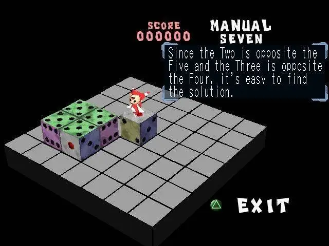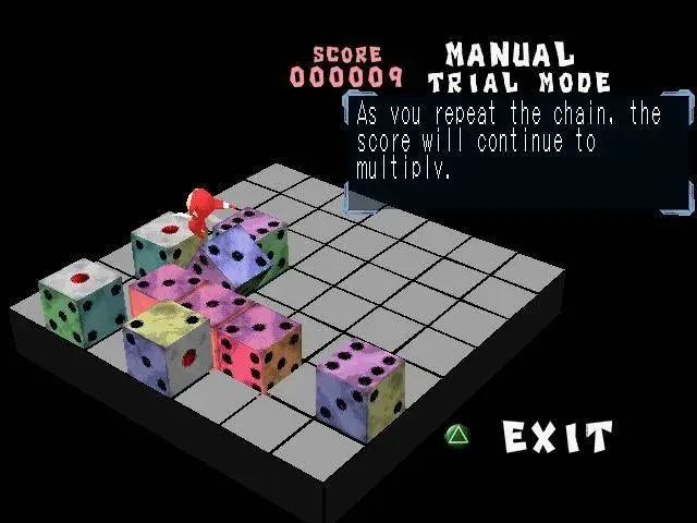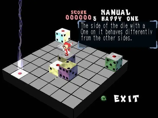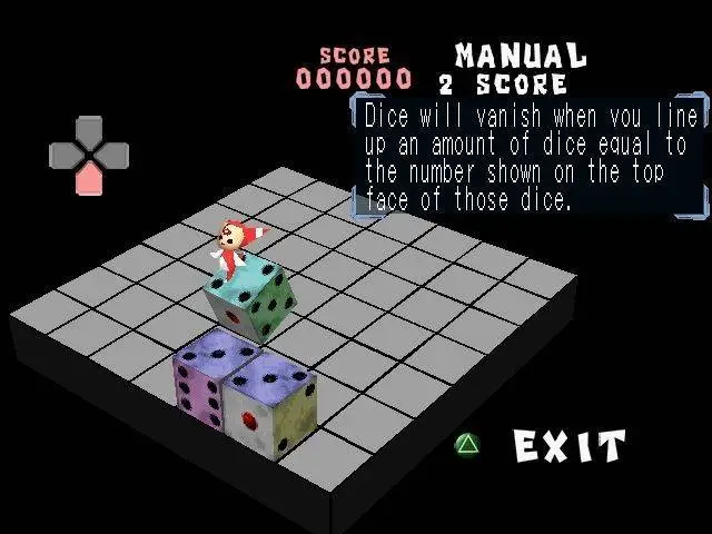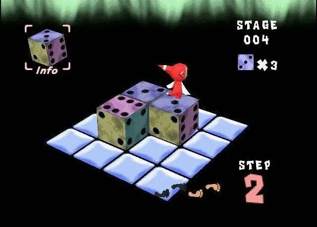 Devil Dice is a unique puzzle game, where the player controls a small devil that runs around a grid covered in large dice. The player can both stand atop dice, and stand on the ground (with the dice towering above). When standing on the dice, the player can move from die to die, or can roll a die in the direction he or she runs, revealing a different face as the die rotates. Creating a group of adjacent dice with identical pips—the size of which must be at least the number of pips—causes those dice to slowly sink into the field before disappearing. Chain reactions are possible by adding additional dice to a sinking set. Different types of dice are available in some modes, with different properties to make the game more challenging.