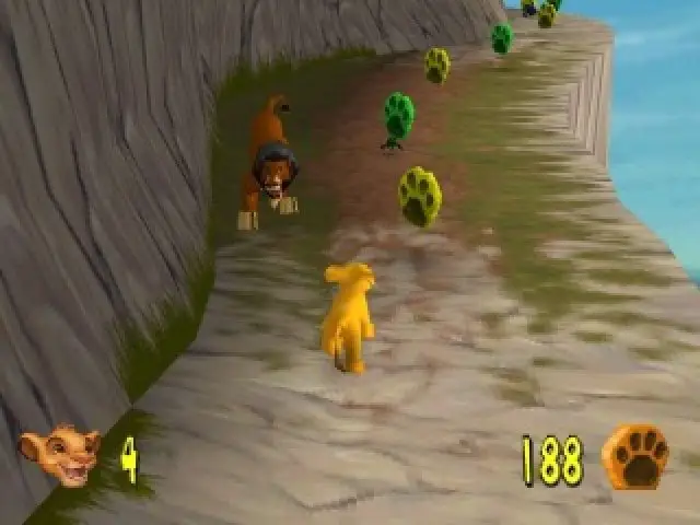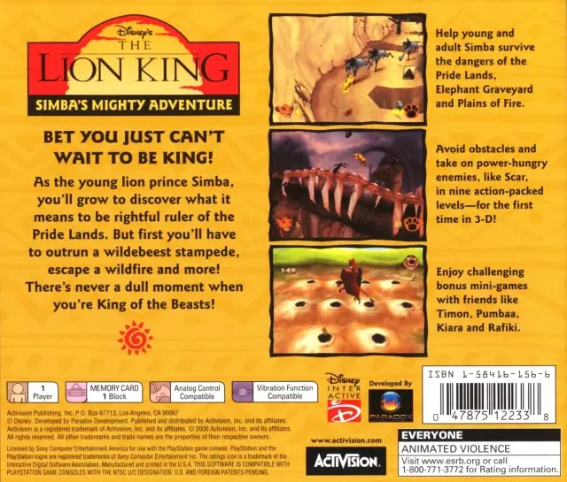 After his father is killed, the young lion prince Simba must travel through the jungle to find his life’s path. Eventually, he will return home and claim his rightful place as the Lion King. On his journey, Simba must avoid such dangers of the jungles and plains as wildebeests and rhinos. When he encounters these enemies as a cub, his roar does little to scare them off. However, maturing into a majestic lion deepens his voice and makes the growl useful as a weapon. As he explores the nine levels, Simba will be able to collect a wide variety of items that will open several bonuses that include puzzles, mini-games, and movies. While the film was animated in 2D, Simba and his world are rendered in three dimensions, and the plot unfolds in cinematic sequences between each level. You’ve got to help Simba take his rightful place in DISNEY’S THE LION KING: Simba’s Mighty Adventure.